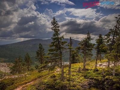 Góra Ylläs, Laponia, Drzewa, Trawa, Chmury, Góry, Finlandia, Wzgórza, Mech