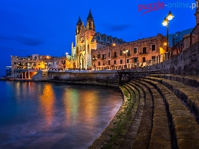 Saint Julians, Kościół Karmelitów, Światła, Schody, Malta, Zatoka Balluta Bay, Kościół parafialny pw. Najświętszej Marii Panny z Góry Karmel