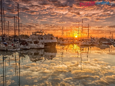 San Diego, Stan Kalifornia, Chmury, Odbicie, Żaglówki, Jachty, Stany Zjednoczone, Przystań, Wschód słońca