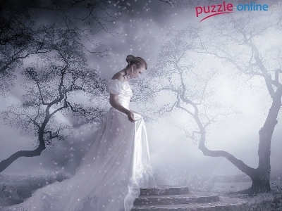 Panna młoda, Biała, Mgła, Kobieta, Suknia, Drzewa
