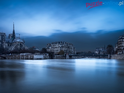 Rzeka Sekwana, Domy, Francja, Paryż, Katedra Notre-Dame
