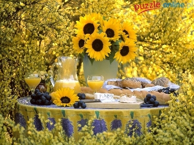 Ser, Bułeczki, Stół, Słoneczniki, Sok, Zastawiony