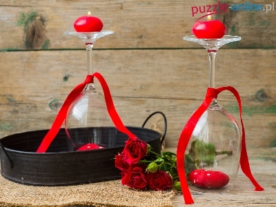 Serca, Wstążki, Róże, Kieliszki, Świeczki