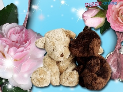 Puzzle Serce, Róże, Misie, Niebieskie tło