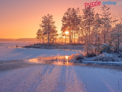 Karelia, Zima, Wschód słońca, Drzewa, Rosja, Rzeka Siegieża