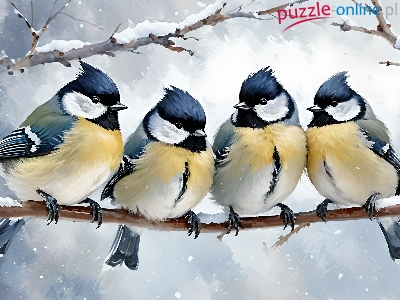 Zima, Bogatki zwyczajne, Sikorki, Ptaki, Grafika, Gałązki