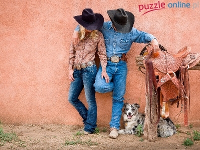 Kobieta, Siodło, Owczarek australijski, Uprząż, Kowboje, Mężczyzna, Pies