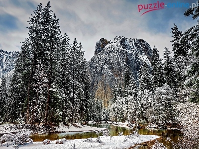 Skała, Drzewa, Zima, Rzeka, Oszronione
