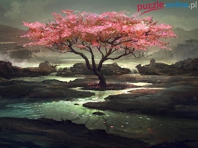 Puzzle Skałki, Różowe, Drzewo, Woda