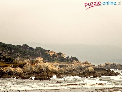 Puzzle Skały, Wybrzeże, Domy, Drzewa