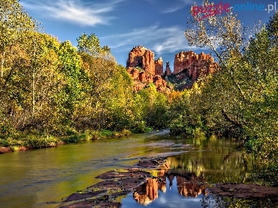 Skały, Rzeka, Drzewa, Odbicie