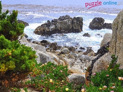 Skały, Krzewy, Morze, Fale, Kamienie