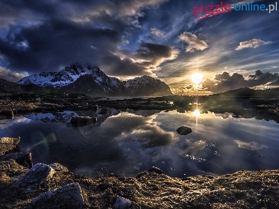 Lofoty, Skały, Niebo, Góry, Norwegia, Zachód Słońca, Jezioro