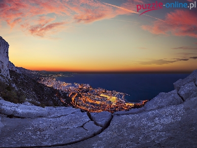 Skały, Morze, Słońca, Monako, Miasto, Zachód