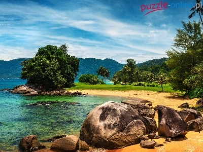 Puzzle Skały, Plaża, Morze, Palmy