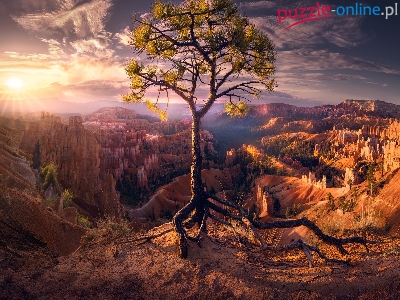 Sosna, Utah, Stany Zjednoczone, Park Narodowy Bryce Canyon, Skały, Promienie, Chmury, Drzewo, Wschód słońca