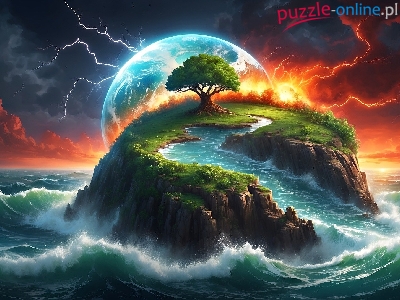 Skały, Morze, Fantasy, Wyspa, Niebo, Drzewo, Planeta, Rzeka, Pioruny