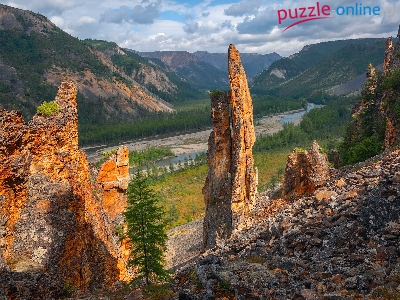 Dolina, Skały, Rzeka, Drzewa, Góry