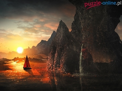Skały, Żaglówka, Fantasy, Zachód słońca, Łódka