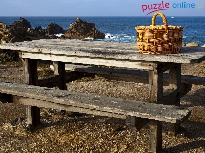 Stół, Skały, Kamienie, Koszyk, Piknik, Ławka, Morze