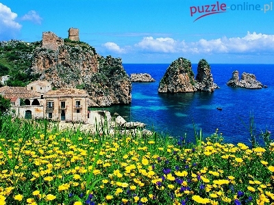 Łąka, Sycylia, Morze, Skały, Domy