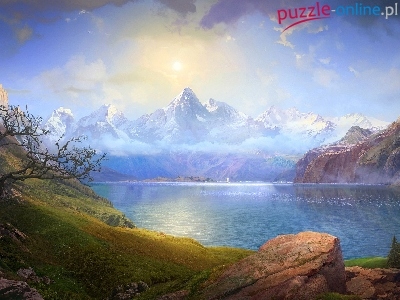 Szczyty, Skały, Drzewo, Słońce, Ośnieżone, Górskie, Jezioro