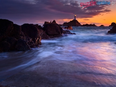 Puzzle Skały, Latarnia Morska, Morze, Zachód Słońca