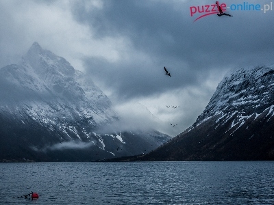 Skały, Chmury, Norwegia, Zatoki, Ptaki