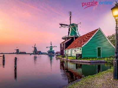 Latarnia, Wiatraki, Rzeka, Zachód słońca, Łódź, Zaandam, Holandia, Domy, Skansen Zaanse Schans