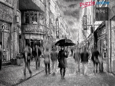 Puzzle Sklepy, Ludzie, Deszcz, Ulica