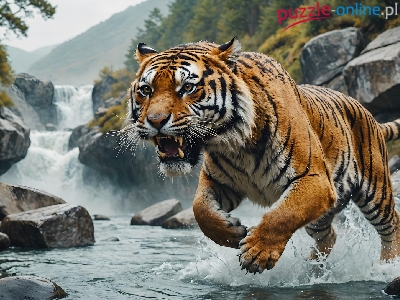 Kły, Rzeka, Zwierzę, Tygrys, Dzikie, Przyroda, Skok, Sierść, Drapieżne, Pręgi, Ogon, Natura, Kamienie, Paszcza, Woda, Akcja