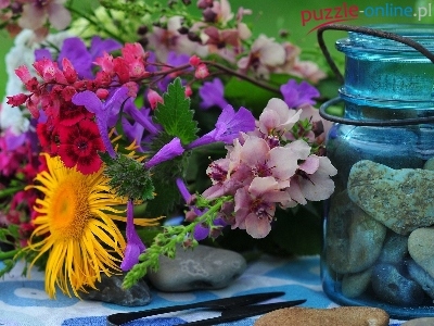 Puzzle Słoik, Bukiet, Kwiaty, Kamienie