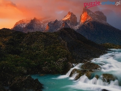 Masyw Torres del Paine, Andy, Wodospad, Chile, Góry, Zachód słońca