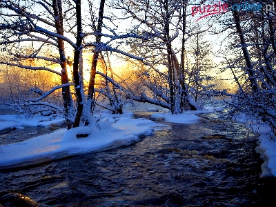 Puzzle Śnieg, Drzewa, Zachód Słońca, Rzeka