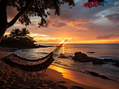 Morze, Drzewo, Zachód słońca, Plaża, Hamak