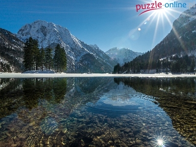 Zima, Góry, Kamienie, Włochy, Jezioro Lago del Predil, Promienie słońca