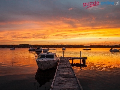 Puzzle Żaglówki, Jezioro, Zachód słońca, Pomost