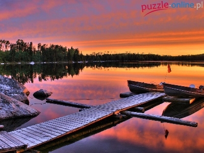 Puzzle Łódki, Jezioro, Zachód słońca, Kamienie