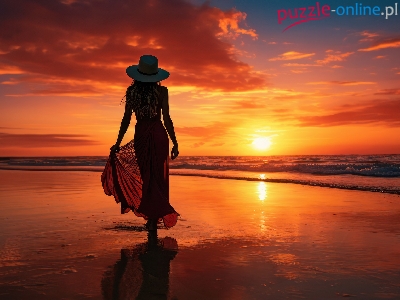 Puzzle Zachód słońca, Kobieta, Morze, Plaża
