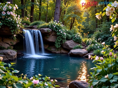 Grafika AI, Las, Wodospad, Kwiaty, Staw, Zachód słońca