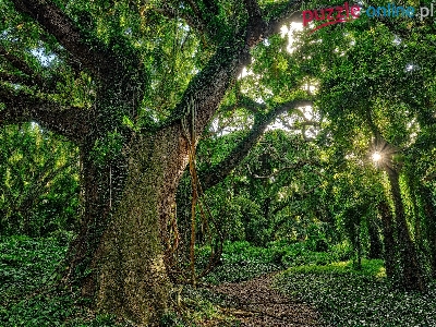 Puzzle Promienie słońca, Las, Drzewa, Ścieżka