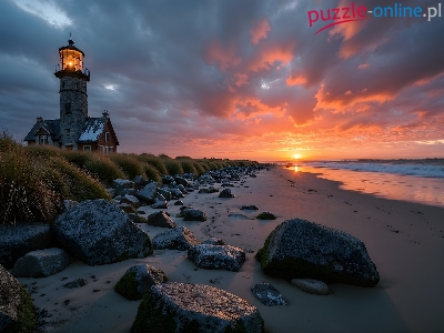 Plaża, Latarnia morska, Morze, Grafika AI, Zachód słońca