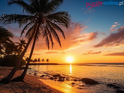 Puzzle Zachód słońca, Morze, Plaża, Palmy