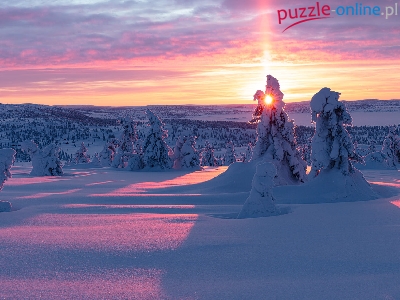 Zima, Śnieg, Wschód słońca, Drzewa, Ośnieżone