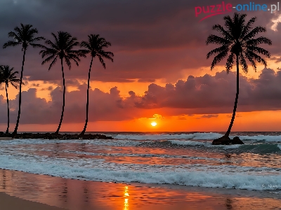 Puzzle Zachód słońca, Palmy, Morze, Chmury