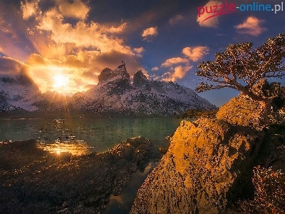 Słońca, Góry, Drzewo, Jezioro, Promienie, Skały
