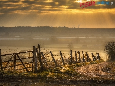 Słońca, Droga, Mgła, Wiejska, Promienie, Ogrodzenie