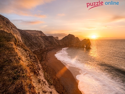 Durdle Door, Wschód słońca, Łuk wapienny, Hrabstwo Dorset, Morze, Skała, Anglia, Wybrzeże Jurajskie
