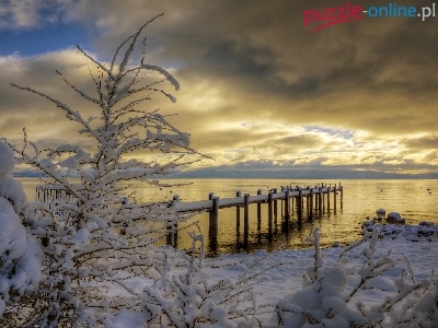Pomost, Jezioro Tahoe, Drzewa, Stany Zjednoczone, Zima, Wschód słońca