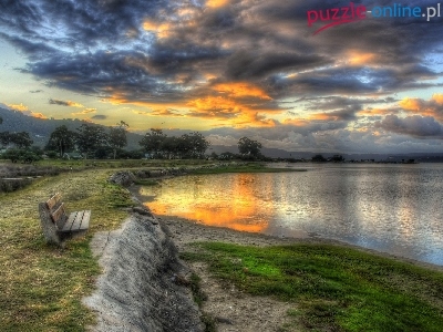 Słońca, Chmury, Brzeg, Jezioro, Wschód, Ławka
